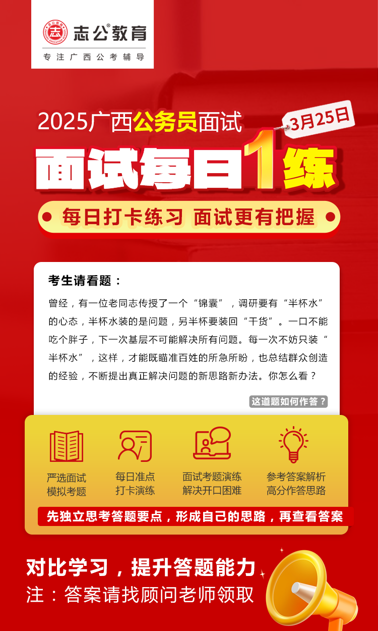 廣西區(qū)考面試準(zhǔn)備需緊扣本土特色,強化邏輯表達和實務(wù)能力,同時注重細節(jié)(如資格復(fù)審材料、禮儀)。建議從現(xiàn)在起每天練習(xí)2-3套題,持續(xù)積累廣西熱點案例,爭取面試高分!資料已經(jīng)為大家準(zhǔn)備好了,快去看看吧!