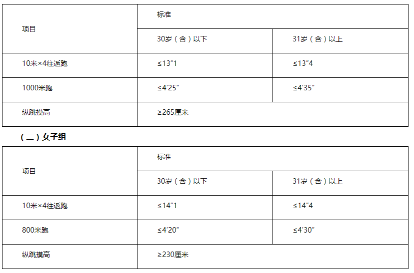 體能測評三項全部達標(biāo)方為合格。體能測評項目中,縱跳摸高的測試次數(shù)不超過3次,10米×4往返跑的測試次數(shù)不超過2次,長跑項目(男子1000米、女子800米)的測試次數(shù)為1次。