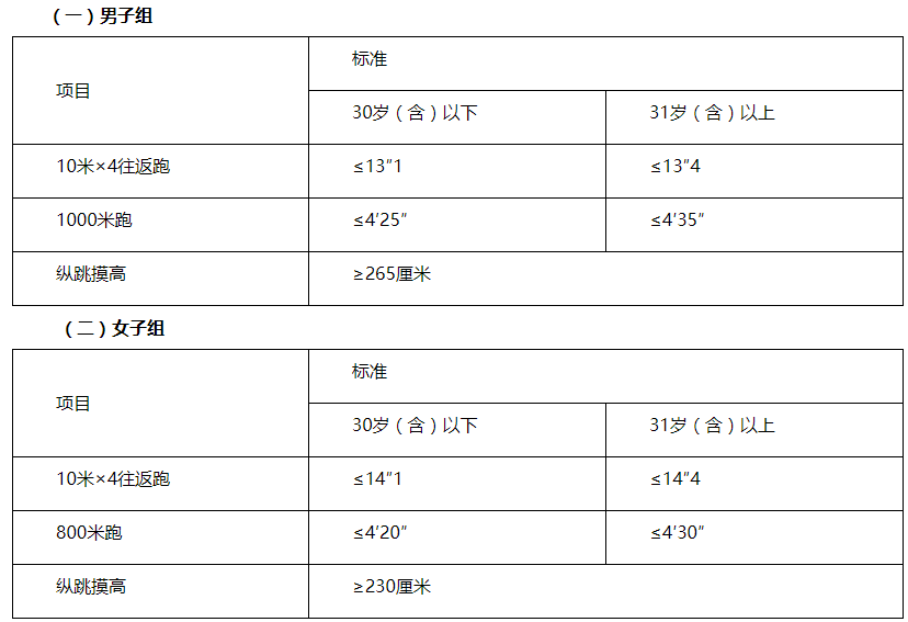 體能測評三項全部達標方為合格。體能測評項目中,縱跳摸高的測試次數(shù)不超過3次,10米×4往返跑的測試次數(shù)不超過2次,長跑項目(男子1000米、女子800米)的測試次數(shù)為1次。