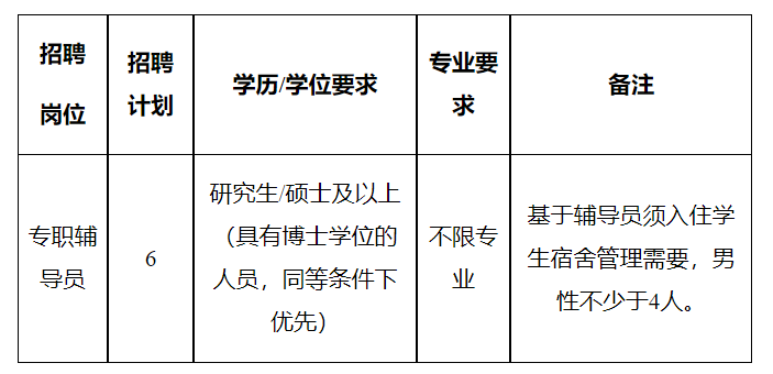 (四)年齡不超過30周歲,即1993年12月1日及之后出生;具有博士學位的,或具有高級職稱的,或有專職輔導員工作經(jīng)驗且在各類輔導員職業(yè)能力競賽、輔導員評優(yōu)評先等活動中獲得過省部級(含)以上獎勵表彰者,年齡可放寬至35周歲,即1988年12月1日及之后出生。