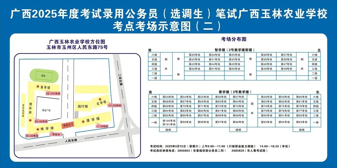 請(qǐng)?zhí)崆傲私獗救怂诳键c(diǎn)具體位置,熟悉考點(diǎn)周邊情況,特別是考點(diǎn)周邊的食宿、交通情況,合理做好食宿安排和出行計(jì)劃。需要特別注意的是:玉林市第一職業(yè)中等專業(yè)學(xué)??键c(diǎn)是設(shè)在該校的東校區(qū)(人民東路東235號(hào));玉林市第一中學(xué)考點(diǎn)是設(shè)在該校的運(yùn)嶺路校區(qū)(二環(huán)北路1228號(hào))!