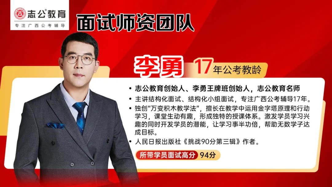 李勇——志公教育創(chuàng)始人、李勇王牌®班創(chuàng)始人,志公教育名師。主講結構化面試、結構化小組面試,專注廣西公考輔導17年。獨創(chuàng)“萬變積木教學法”,擅長在教學中運用金字塔原理和行動學習,課堂生動有趣,形成獨特的授課體系。激發(fā)學員學習興趣的同時開發(fā)學員的潛能,讓學習事半功倍,幫助無數學子達成目標。同時也是人民日報出版社《挑戰(zhàn)90分第三輯》作者。