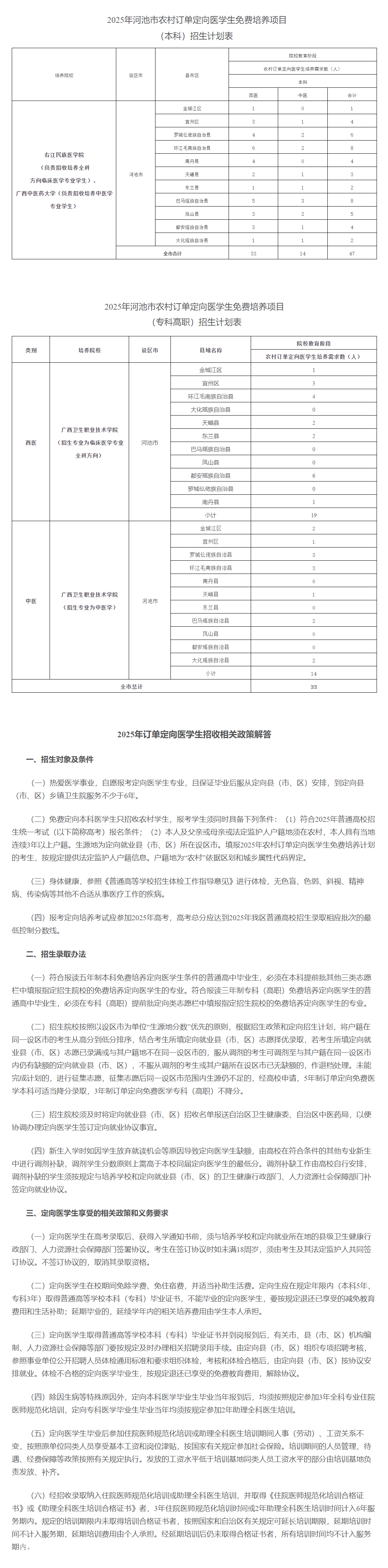 2025年,廣西繼續(xù)實(shí)施定向醫(yī)學(xué)生免費(fèi)培養(yǎng)項(xiàng)目,面向全區(qū)招生。河池市共有80個(gè)名額,其中,本科47個(gè),???3個(gè),培養(yǎng)院校分別為:右江民族醫(yī)學(xué)院、廣西中醫(yī)藥大學(xué)、廣西衛(wèi)生職業(yè)技術(shù)學(xué)院,培養(yǎng)專業(yè)為臨床醫(yī)學(xué)和中醫(yī)學(xué)。