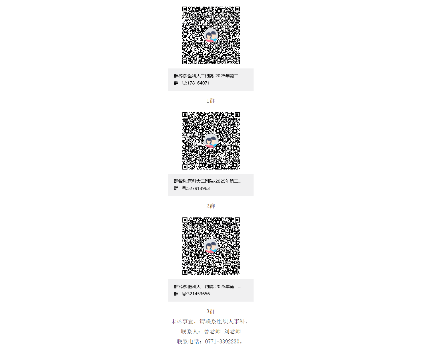 考核與面試的時(shí)間、地點(diǎn)另行通知,擇優(yōu)聘用。通過資格審核的考生名單及相關(guān)考試事宜將在“醫(yī)科大二附院-2025年第二批醫(yī)技藥行政招聘群”發(fā)布,請(qǐng)應(yīng)聘者務(wù)必進(jìn)群并關(guān)注群消息,不再另行通知。請(qǐng)通過搜索群號(hào)碼(1群:178164071、2群:527913963、3群:321453656)或掃碼加群(1群滿后請(qǐng)加2群、3群):