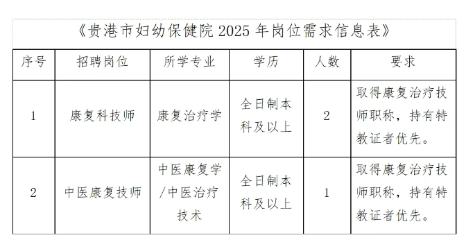 (三)臨床及業(yè)務人員(詳見《貴港市婦幼保健院2025年崗位需求信息表》)