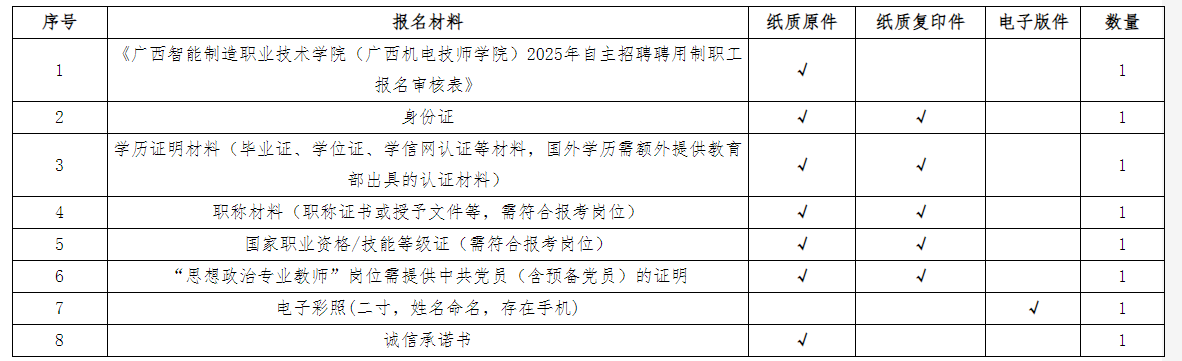 應(yīng)聘者按照招聘崗位具體要求對(duì)口報(bào)名,每名應(yīng)聘者限報(bào)一個(gè)崗位,采用現(xiàn)場(chǎng)報(bào)名遞交應(yīng)聘材料的方式報(bào)名。報(bào)名人員須下載并填寫(xiě)《廣西智能制造職業(yè)技術(shù)學(xué)院(廣西機(jī)電技師學(xué)院)2025年自主招聘聘用制職工報(bào)名審核表》(附表2),同時(shí)需附上相應(yīng)的學(xué)歷、學(xué)位證書(shū)、身份證、職稱證書(shū)(相關(guān)崗位需要)等材料的原件與復(fù)印件(原件審核后退回,復(fù)印件不退回)