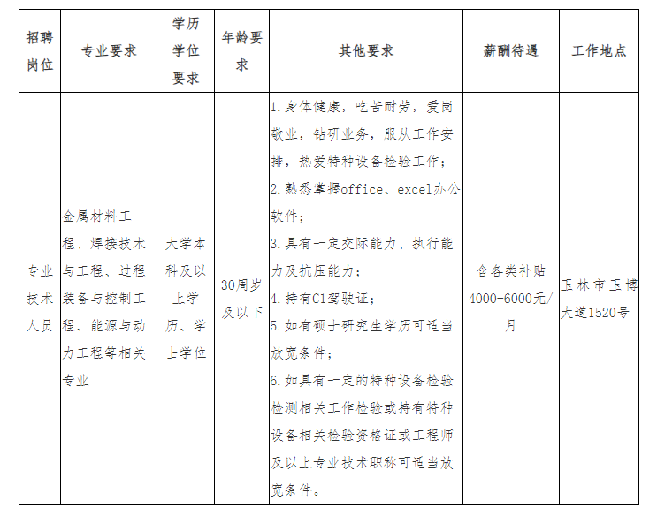廣西壯族自治區(qū)特種設備檢驗研究院玉林分院為廣西壯族自治區(qū)特種設備檢驗研究院下屬分支機構(gòu),根據(jù)業(yè)務發(fā)展需要,現(xiàn)面向社會公開招聘編外聘用人員1名,崗位需求如下: