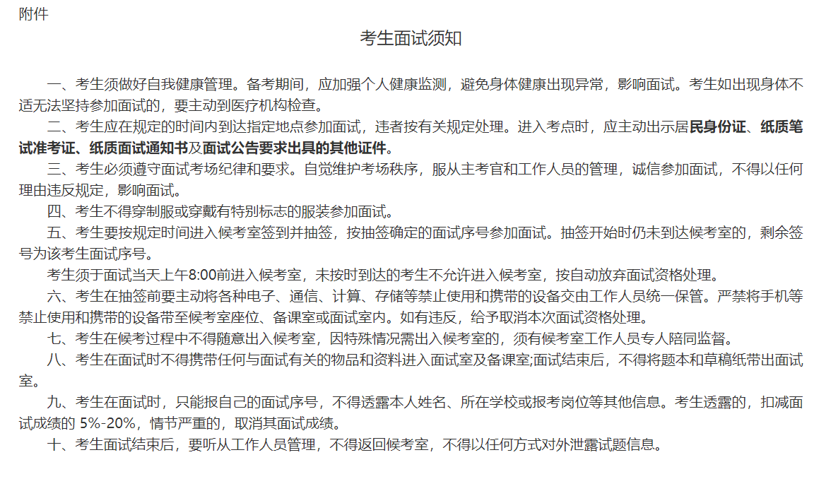 (四)考生在面試時,只能報自己的面試序號,不得透露考生姓名、所在學?;騿挝?、籍貫等信息??忌嘎兜?,扣減面試成績的5%-20%,情節(jié)嚴重的,取消其面試成績。