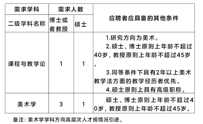 美術(shù)學(xué)院2025年計劃在美術(shù)學(xué)、課程與教學(xué)論(美術(shù))等專業(yè)方向招聘6位專任教師,其中計劃招聘博士或者教授4人,碩士2人。