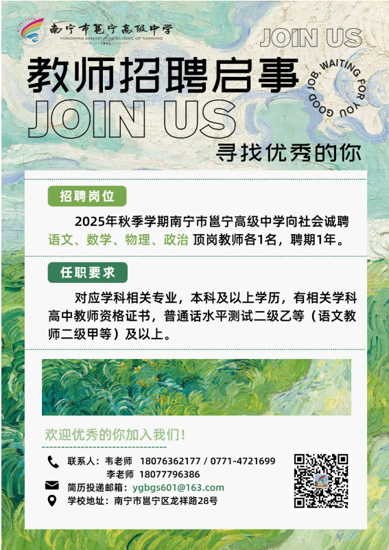 原文標(biāo)題:南寧市邕寧高級(jí)中學(xué)2025年秋季學(xué)期教師招聘啟事