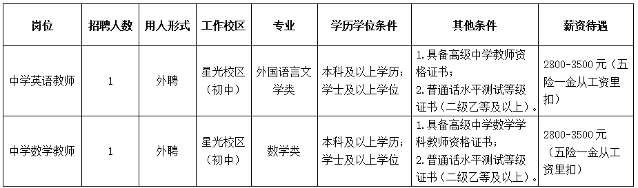 根據(jù)學(xué)校工作需要,南寧市第十中學(xué)星光校區(qū)(初中部)面向社會招聘教職工,具體崗位如下: