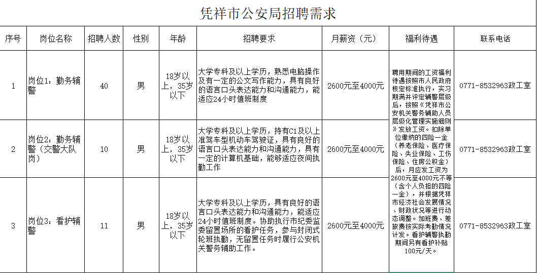 (二) 報(bào)名地點(diǎn)憑祥市公安局(憑祥市北大路69號(hào))報(bào)名及咨詢電話:0771-8532963報(bào)名投簡歷郵箱:pxgazgs@163.com報(bào)名請(qǐng)附上身份證復(fù)印件、學(xué)歷畢業(yè)證書復(fù)印件