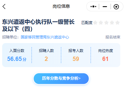 其中東興遣返中心執(zhí)行隊(duì)一級(jí)警長(zhǎng)及以下(四)崗位歷年入面分為56.65分、報(bào)考人數(shù)為59人↓