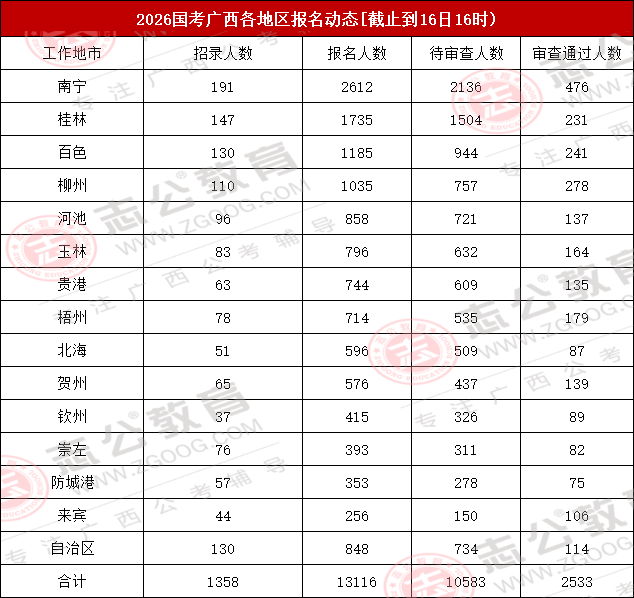 今天是報名第二天,小伙伴可要抓住此次上/岸機(jī)會啦!來看看廣西今天的報名數(shù)據(jù)吧。截止10月16日下午16:00,已經(jīng)有13116名考生報名,最熱崗220人報名!從各項數(shù)據(jù)來看,部分考生可能還持觀望態(tài)度。在接下來的報名時間里,可能會迎來報名人數(shù)大幅增長的情況,大家可以密切關(guān)注。