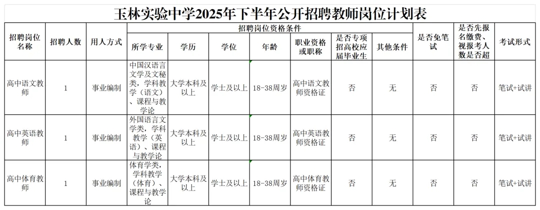 具體招聘信息請瀏覽玉林市人社局網(wǎng)站相關公告,以《玉林市2025年下半年公開招聘中小學幼兒園教師公告》為準。
