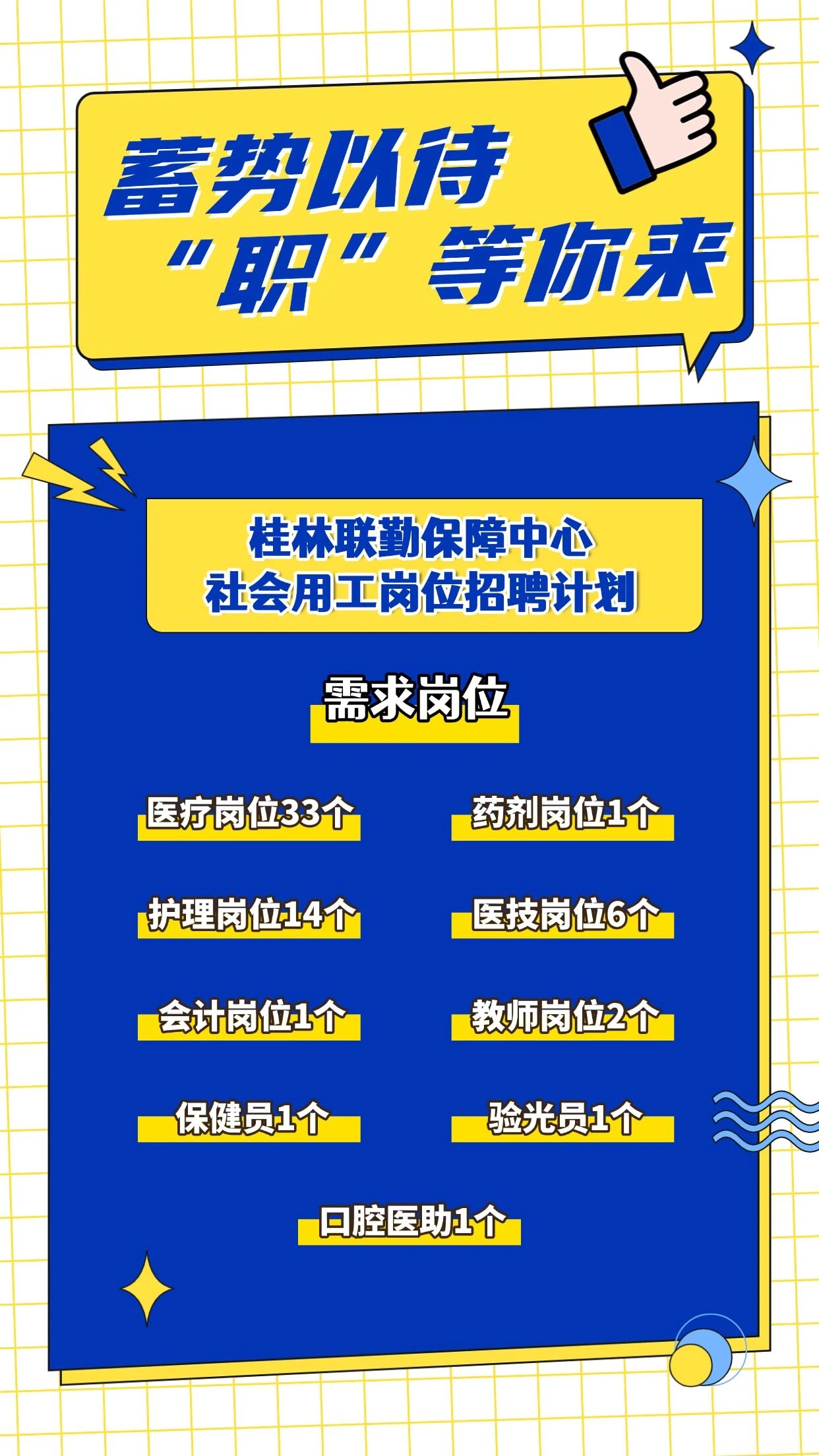 此次發(fā)布桂林聯(lián)勤保障中心社會用工崗位招聘計劃60個,其中:專業(yè)技術崗位58個(醫(yī)療33個、藥劑1個、護理14個、醫(yī)技6個、會計1個、教師2個、保健員1個)、工勤技能崗位2個(驗光員1個、口腔醫(yī)助1個)。