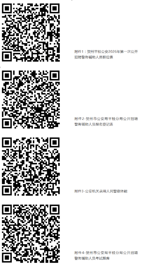 報考人員自2026年1月26日起,可通過賀州市公共就業(yè)和人才服務中心“賀州市微就業(yè)”官方微信(gxhzjy)、賀州市公安局平桂分局“平桂警方”官方微信(pggafj)查閱招聘簡章及《職位計劃表》(附件1)等相關(guān)招聘信息。