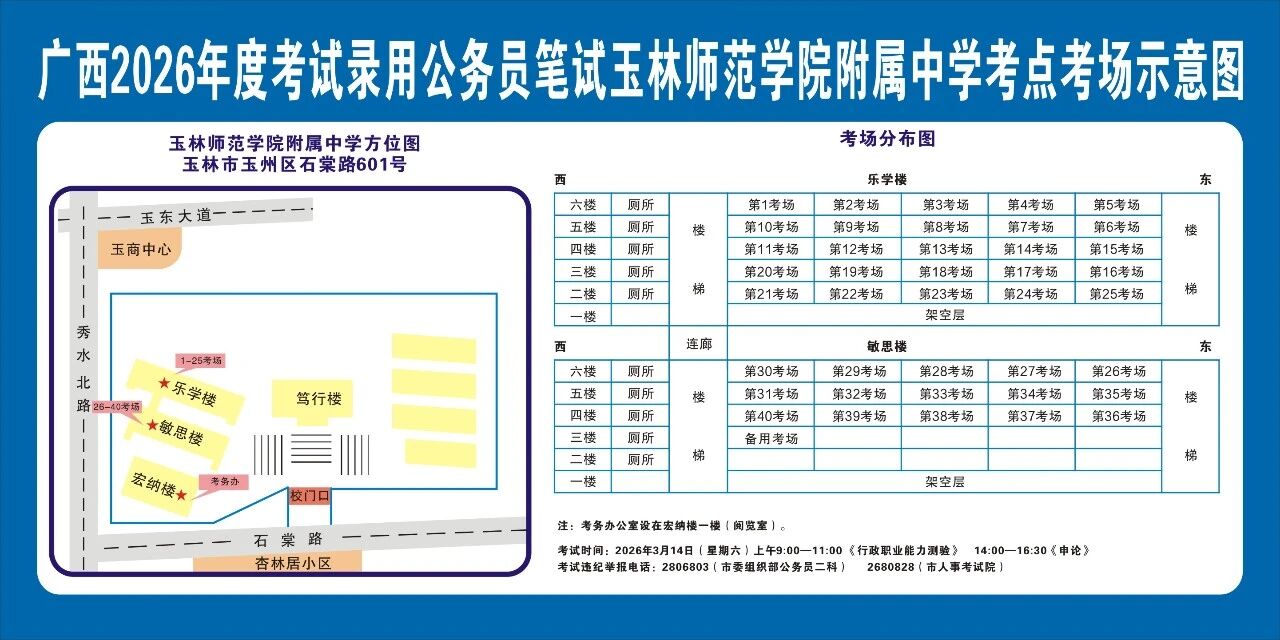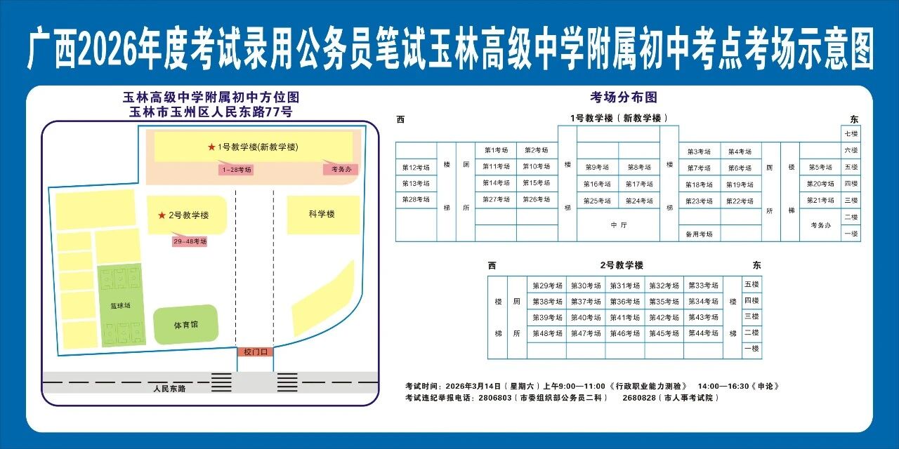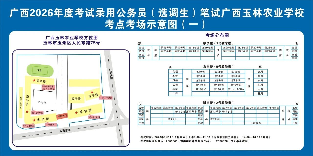 請(qǐng)及時(shí)登錄“廣西人事考試網(wǎng)”打印筆試準(zhǔn)考證并妥善保管,仔細(xì)查看準(zhǔn)考證上的考點(diǎn)信息。本次考試玉林市考區(qū)共設(shè)10個(gè)考點(diǎn),各考點(diǎn)名稱及地址如下: