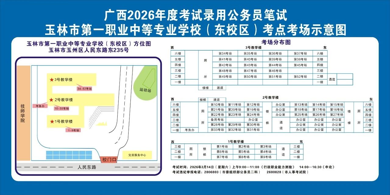 請(qǐng)?zhí)崆傲私獗救怂诳键c(diǎn)具體位置,熟悉考點(diǎn)周邊情況,特別是考點(diǎn)周邊的食宿、交通情況,合理做好食宿安排和出行計(jì)劃。需要特別注意的是:玉林市第一職業(yè)中等專業(yè)學(xué)??键c(diǎn)是設(shè)在該校的東校區(qū)(人民東路東235號(hào));玉林市第一中學(xué)考點(diǎn)是設(shè)在該校的運(yùn)嶺路校區(qū)(二環(huán)北路1228號(hào))!