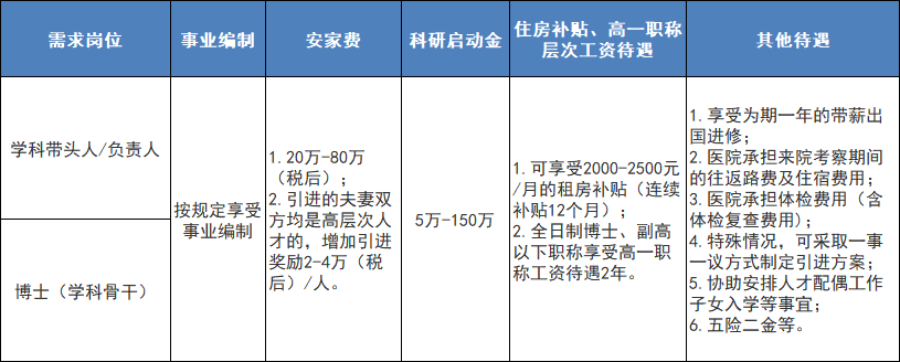 待遇參照國家事業(yè)單位標(biāo)準(zhǔn)或按照醫(yī)院相關(guān)規(guī)定執(zhí)行,根據(jù)不同人員類別給予5萬元至10萬元(稅后)安家補(bǔ)助獎(jiǎng)勵(lì),具體內(nèi)容請(qǐng)仔細(xì)閱讀招聘公告。