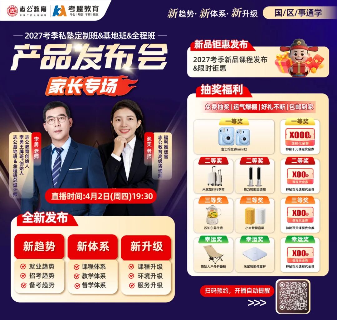 面對孩子棘手的就業(yè)與考公難題,家長們往往深感無力。針對這一系列關(guān)切的痛點(diǎn),志公教育于4月2日(周四)19:30舉辦“新趨勢·新體系·新升級——2027考季公考產(chǎn)品發(fā)布會”重磅直播,從專業(yè)的角度分析解讀當(dāng)前就業(yè)、招考、備考的新趨勢,為廣大學(xué)子及家長送上備考的“及時(shí)雨”,滿足家長和學(xué)子們對獲得更優(yōu)質(zhì)的學(xué)習(xí)環(huán)境、課程體系、督學(xué)服務(wù)、教學(xué)成果的期待。同時(shí)直播間免費(fèi)送出更多超值福利。