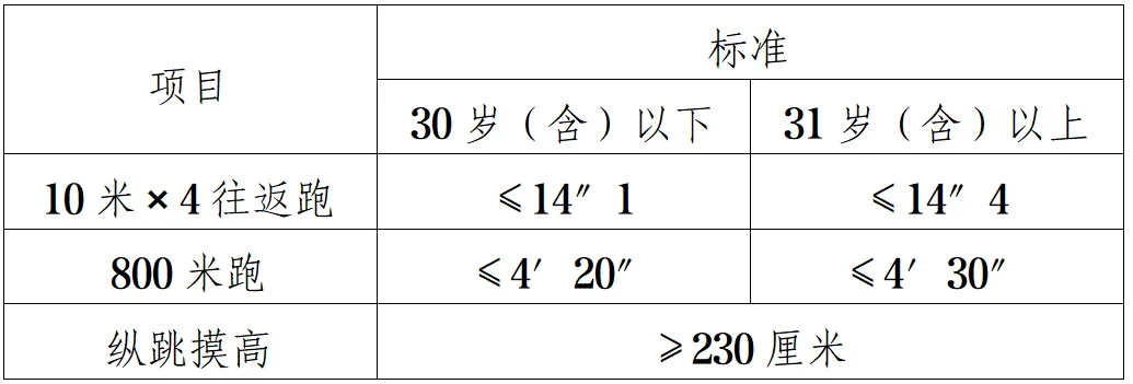 按照《關(guān)于印發(fā)〈公安機(jī)關(guān)錄用人民警察體能測評(píng)項(xiàng)目和標(biāo)準(zhǔn)〉的通知》(公政治〔2024〕60號(hào))執(zhí)行。體能測評(píng)項(xiàng)目包括10米×4往返跑、1000米(男)/800米(女)跑、縱跳摸高等3個(gè)項(xiàng)目。其中,綜合管理類、執(zhí)法勤務(wù)類職位測查全部3個(gè)項(xiàng)目,警務(wù)技術(shù)類職位免予測查1000米(男)/800米(女)跑項(xiàng)目;對(duì)于專業(yè)人才緊缺難以形成競爭的特殊職位(緊缺職位),報(bào)考人員需在參加體能測評(píng)前,從3項(xiàng)體能測評(píng)項(xiàng)目中選擇2項(xiàng)參加測試。凡應(yīng)測項(xiàng)目中任意一項(xiàng)不達(dá)標(biāo)的,即為體能測評(píng)不合格。具體如下: