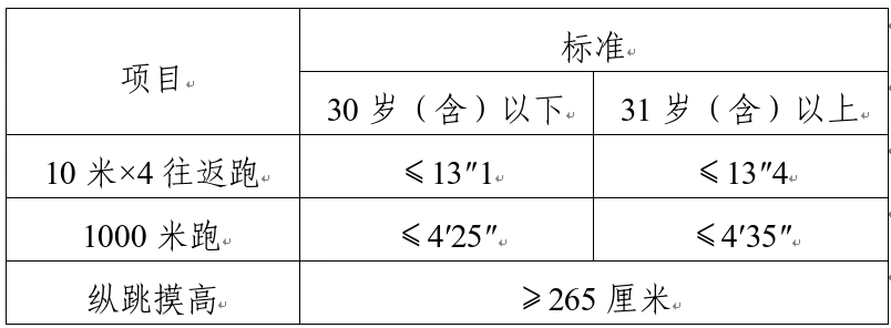 綜合管理類、執(zhí)法勤務(wù)類職位測查全部三個項目,三項全部達(dá)標(biāo)方為合格;警務(wù)技術(shù)類職位免予測查1000米(男)/800米(女)跑項目,其他兩項全部達(dá)標(biāo)方為合格;報考外語及少數(shù)民族語言翻譯緊缺職位的人員,體能測評三項中有兩項達(dá)標(biāo)的,視為合格。